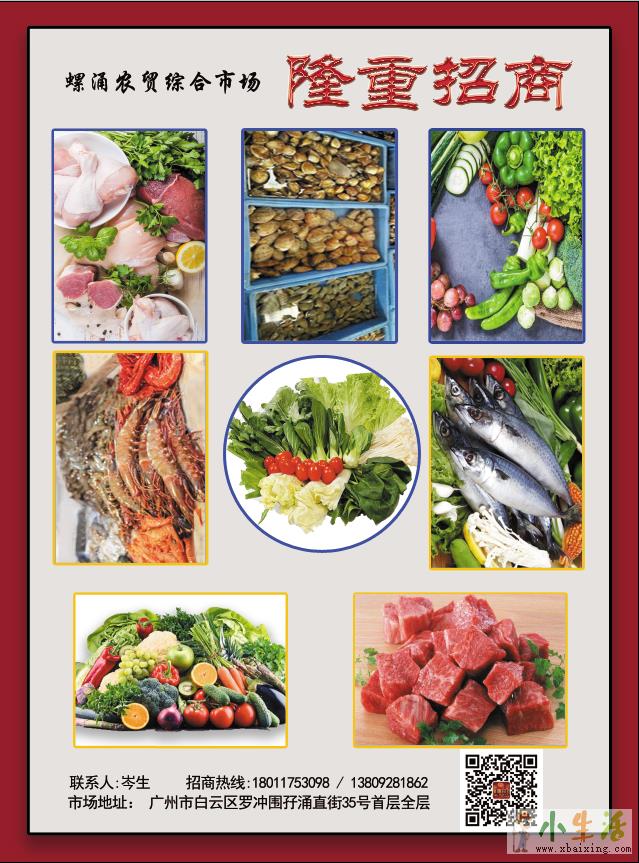 螺涌肉菜市场位于广州市白云区螺涌村孖涌路大街,临近螺涌小学,佳丽轩小区,佳星楼小区,厂房众多,交通便利。于2020年12月装修开业,现邀 熟食,肉类,蔬菜类,海鲜类档主入驻。商场式管理,人性化服务,诚邀您的加入www.xbaixing.com小生活网
