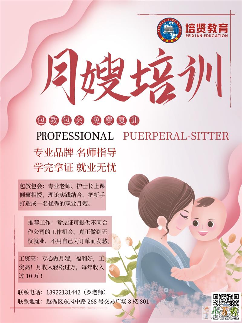 广州市越秀区培贤职业培训学校,是广州市人社局批准成立的一家职业培训学校(批准文号:4401044120002),具有合法办学许可证和培训资质的正规培训机构,也是广州声誉较好且位处市中心位置的培训学校来自www.xbaixing.com。广州市培贤职业培训学校先后开设了保育员、育婴师、妇婴护理(月嫂)、小儿推拿师、催乳师、产后康复师等课程,累计培训了一万三千多名学员,与褓力生物科技有限公司等企业合作输送人才欢迎www.xbaixing.com。【课程内容】1、怀孕期的身体变化和特点、护理;技能;2、产后的生理、心理的变化,生活照料、饮食护理等;技能;3、新生儿及婴幼儿的生理发育特点;技能;4、新生儿及婴幼儿的生活照料、保健锻炼等;技能;5、新生儿及婴幼儿的疾病的预防和护理,意外伤害的预防和护理;技能www.xbaixing.com。6、药膳月子餐与产妇营养【报名须知】现在报名,还能限时享受优惠,名额有限,额满即止【报考要求】年满18周岁,初中以上学历【招生对象】年满18周岁,初中以上学历,有意从事妇婴护理(月嫂)等保健行业,或者想通过学习更多妇婴护理知识,更好地照顾自己孩子的人士www.xbaixing.com小百姓网。【学校优势】与多家母婴护理服务类公司公司签订合作协议,学员毕业拿证即可推荐就业x b a i x i n g c o m。强大的师资阵容的证书体系完善的就业支持10000+名学员成功就业